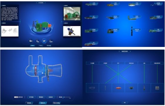 ②水轮机结构认知模块。提供混流式、轴流式、灯泡贯流式及水斗式四种典型水轮机的全三维精细模型;支持从任意角度旋转、缩放观察整体结构,并可逐层拆解转轮、导叶、蜗壳、主轴等核心部件,清晰展示各部件的装配关系与工作原理,为水轮机选型奠定直观认知基础。